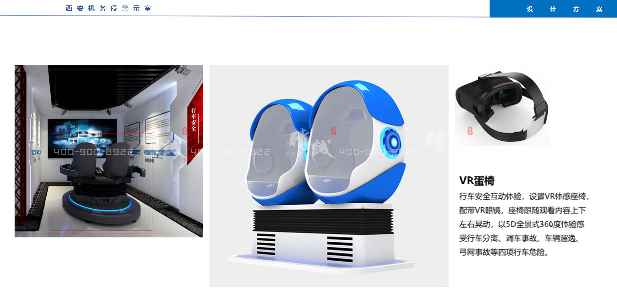 4.VR蛋椅:行車安全互動(dòng)體驗(yàn),設(shè)置VR體感座椅,配帶VR眼鏡,座椅跟隨觀看內(nèi)容上下左右晃動(dòng),以5D全景式360度體驗(yàn)感受行車分離、調(diào)車事故、車輛溜逸、弓網(wǎng)事故等四項(xiàng)行車危險(xiǎn)。