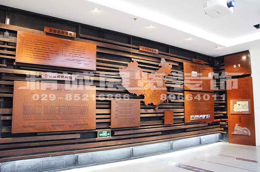 序廳總覽部分以銹跡斑斑的鐵軌和鋼板為元素展示了企業(yè)70年崢嶸歲月的駐地變遷和名稱變動。