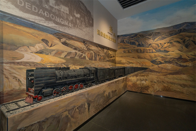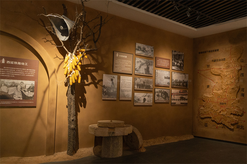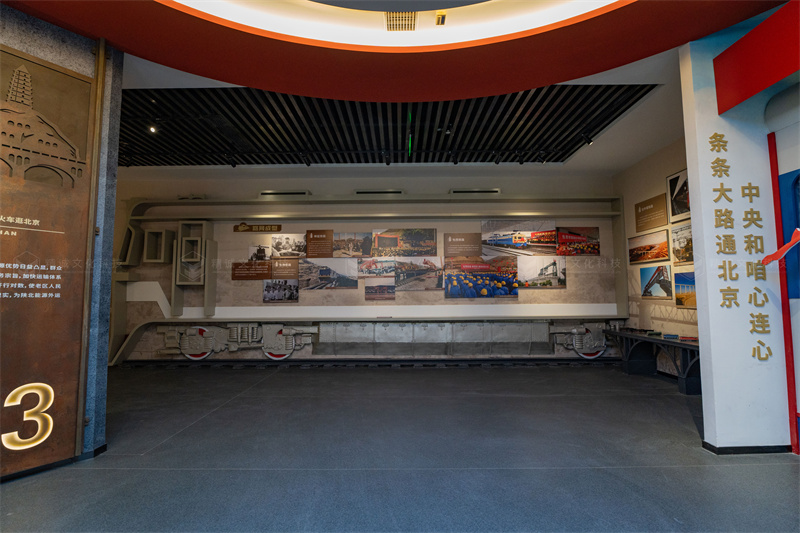 展示標(biāo)題上,采用當(dāng)?shù)亓鱾鞯蔫F路民謠進行編織,將其劃分成“筑路?中央和咱心連心”“圓夢?火車開到寶塔山”“發(fā)展?坐上火車逛北京”“騰飛?巨龍馳騁譜新篇”四大版塊,以全方位展現(xiàn)陜北鐵路從規(guī)劃、建設(shè)到發(fā)展壯大的歷史進程,進而生動反映陜北鐵路取得的突出成就及對陜北革命老區(qū)經(jīng)濟社會發(fā)展的推動作用。