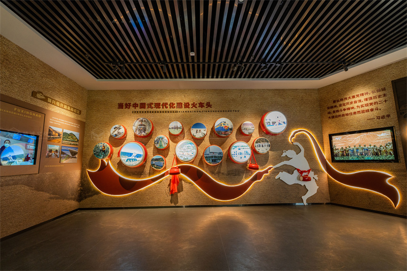 在展示內(nèi)容上,以陜北革命老區(qū)人民對鐵路的情感變遷為主線,采用獨特的文化視角生動呈現(xiàn)了老區(qū)人民從剛開始的殷切期盼、到建成開通的歡欣鼓舞,再到新時代的慷慨激昂等一系列的情感變化路程。鐵路行業(yè)展館設(shè)計施工-陜北鐵路展館案例展示