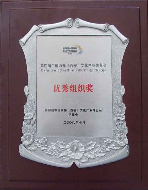 上圖是我們的第四屆中國(guó)西部(西安)文化產(chǎn)業(yè)博覽會(huì)組委會(huì)2008年十月頒發(fā)的第四屆中國(guó)西部(西安)文化產(chǎn)業(yè)博覽會(huì)優(yōu)秀組織獎(jiǎng),證書,以資鼓勵(lì)!