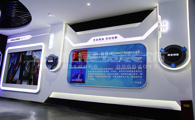 序廳以“大眾創(chuàng)業(yè) 萬眾創(chuàng)新”的理念為出發(fā)點(diǎn),提取“創(chuàng)新、創(chuàng)業(yè)”為空間設(shè)計(jì)的設(shè)計(jì)理念,展示國家政策、社會(huì)發(fā)展、學(xué)生就業(yè)、科技創(chuàng)新等方面內(nèi)容,更好地實(shí)現(xiàn)人們的精神追求和自身價(jià)值。